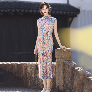 一襲彩蝶旗袍,採用無袖長款的改良設計,完美融合了傳統與現代元素,盡顯東方女性的高級復古感。這種旗袍通常以精致的彩蝶圖案爲
