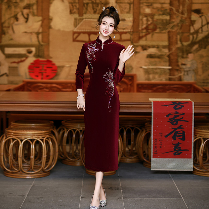 對於喜婆婆而言,婚宴着裝不僅是一件衣服,更是對新人的祝福、對場合的重視,以及自身氣質的表達。這款 “燙鑽長袖旗袍”,以璀璨燙鑽點亮優雅,以經典版型彰顯端莊,讓喜婆婆在見證新人幸福的同時,也能成爲婚宴上優雅得體、貴氣十足的焦點,爲這場特殊的盛典增添一抹動人的東方韻味。