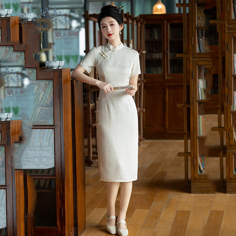 在復古元素的運用上,這款旗袍也格外 “克制”,避免復雜設計給小個子帶來的 “沉重感”,只保留最經典的國風符號,讓韻味與輕盈感並存。領口採用簡約的小立領,搭配一粒精致的盤扣,沒有多餘的刺繡或珠飾,幹淨利落卻不失典雅,不會讓頸部線條顯得局促;袖口則設計成短袖樣式,露出纖細的手臂,在春夏季節穿更清爽,也能減少上半身的 “包裹感”,讓整體造型更顯輕盈。