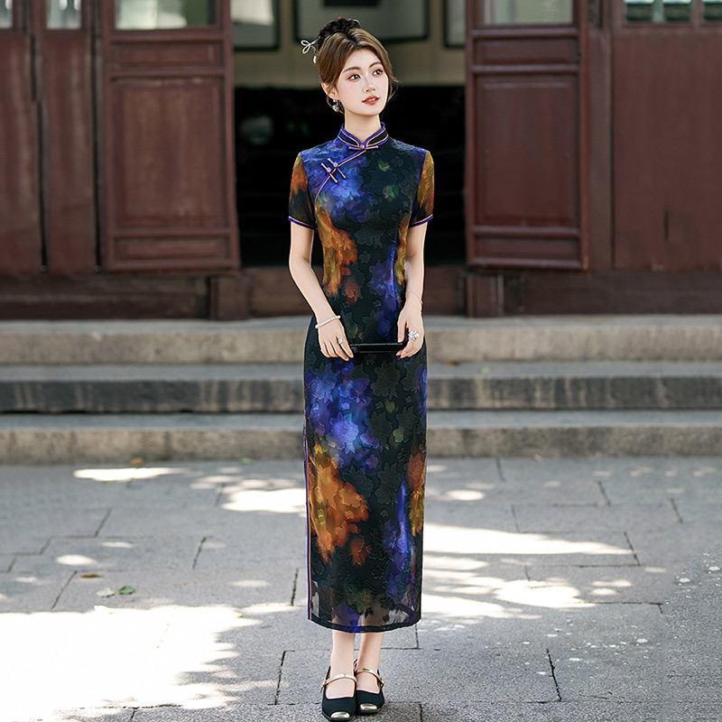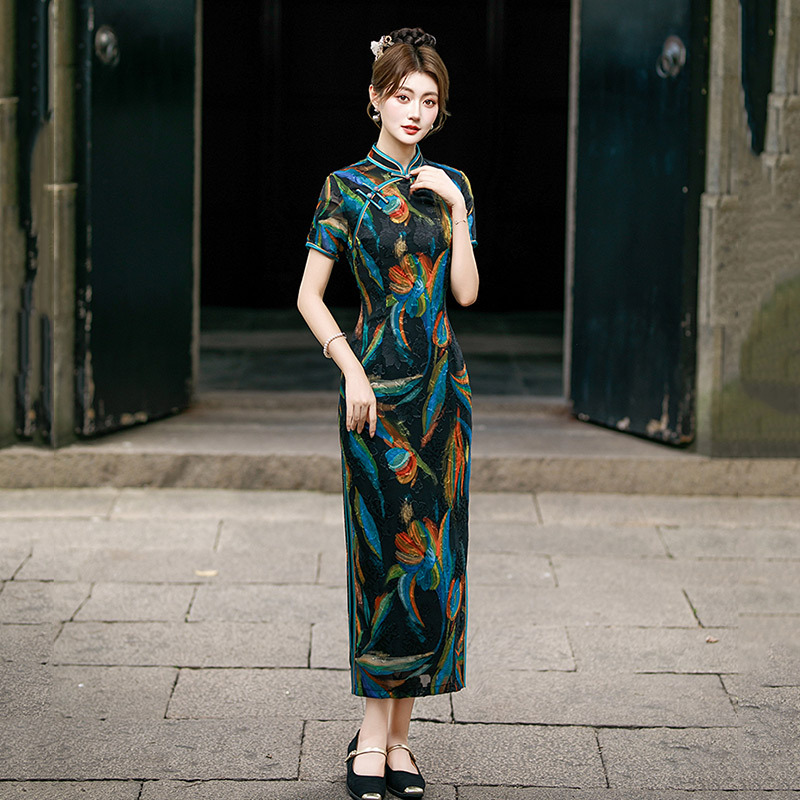 “復古短袖” 的設計,恰好戳中了秋日穿搭的痛點。初秋午後陽光還帶着暖意,短袖能避開長袖的悶熱,露出的手臂線條在光影裏更顯靈動;等到早晚微涼時,外搭一件針織開衫或短款風衣,既不會遮住旗袍的美感,又能抵御秋風,一衣多穿的實用性拉滿。而 “長款設計” 則藏着顯瘦顯高的小心機,從腰部自然垂落的裙擺,能巧妙遮住腿部的小瑕疵,行走時裙擺隨步伐擺動,自帶優雅的韻律感,不管是搭配平底繡花鞋,還是低跟瑪麗珍鞋,都能輕鬆穿出高挑身姿。