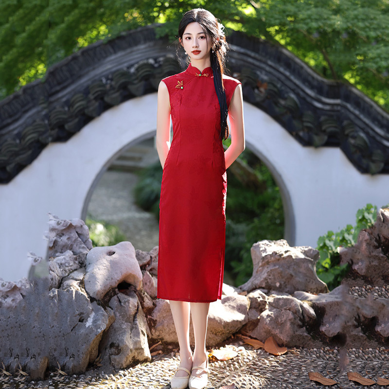 婚禮後的敬酒環節要溫婉得體,回門時見長輩需端莊雅致 —— 一件能兼顧兩種場景的禮服,是許多新娘的 “剛需”。而無袖國風改良旗袍,恰好把 “中式浪漫” 與 “實用適配” 揉成了經典:它保留了傳統旗袍的盤扣、斜襟等東方元素,又用無袖設計、修身收腰剪裁貼合現代審美,既能在敬酒時襯得新娘身姿窈窕、氣質溫婉,回門穿也能盡顯乖巧精致,讓新娘在重要時刻 “一眼淪陷”,更讓在場之人過目難忘。今天就從設計、場景、細節三個維度,拆解這件 “一衣兩穿” 的新娘禮服,看它如何撐起敬酒與回門的雙重儀式感。
