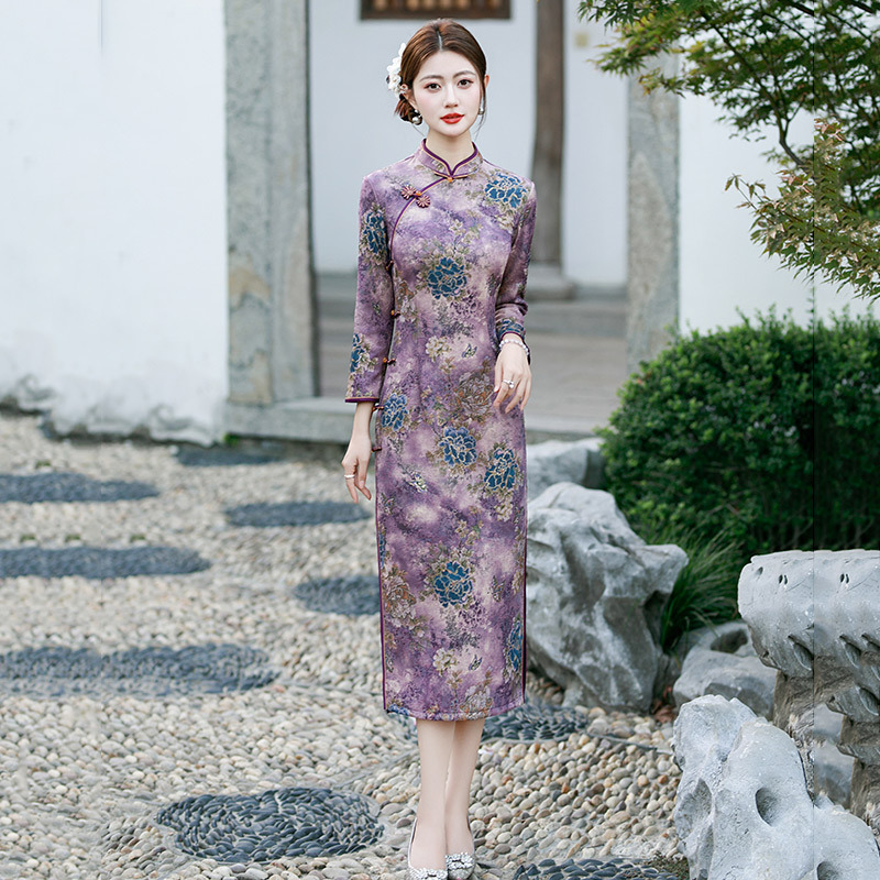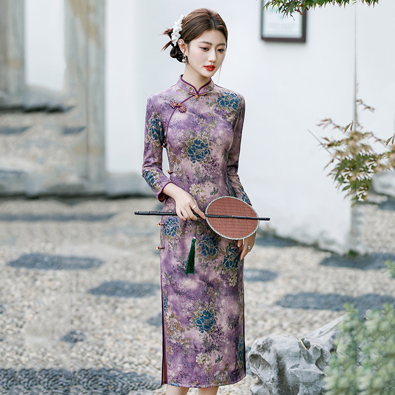 當紫色與中式旗袍相遇,便暈染出東方美學獨有的浪漫 —— 那不是張揚的豔紫,而是如薄霧般輕柔的 “紫煙”,悄悄漫過衣襟,裹着時光的溫潤,再配上復古剪裁與長款設計,將身形曲線襯得愈發窈窕,讓每一步行走都似帶着古典畫卷裏的韻律,美得含蓄又驚豔。