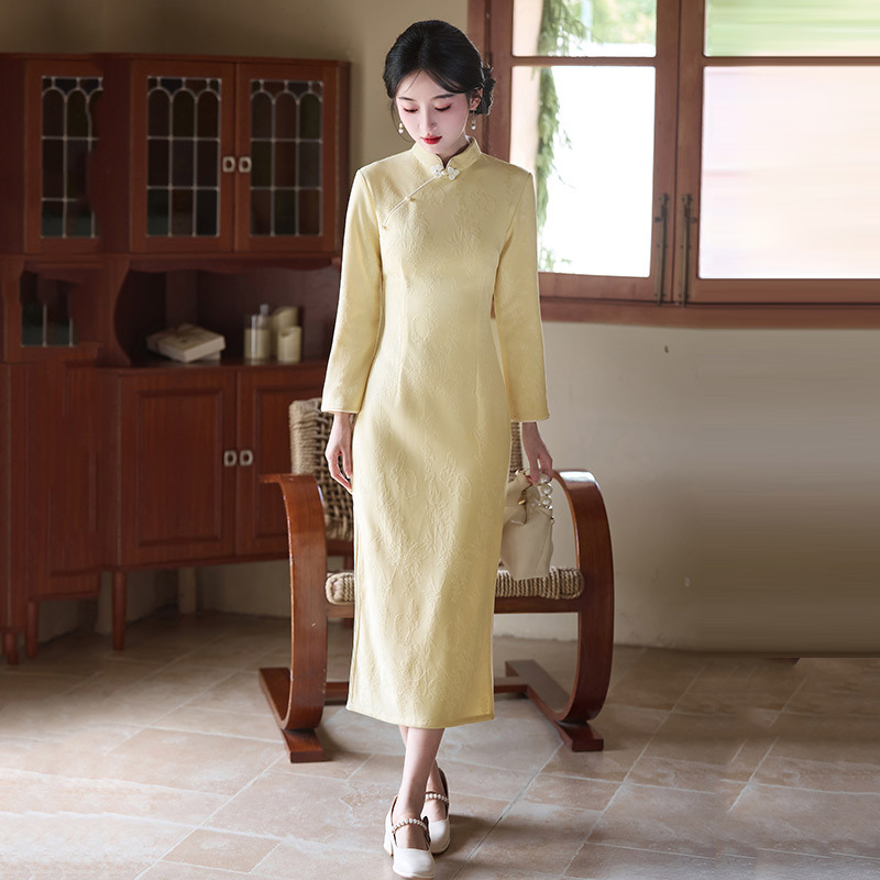 內搭的長款改良旗袍,打破了傳統旗袍的束縛感,更貼合現代女性的日常需求。衣長及膝下,對身材包容性極強,無論是梨形、蘋果形身材,都能通過恰到好處的收腰設計勾勒出腰線,卻不緊繃勒肉;袖口做了微寬鬆的長袖處理,既能擋住秋日的微涼,又不會顯得臃腫,擡手間盡顯利落。