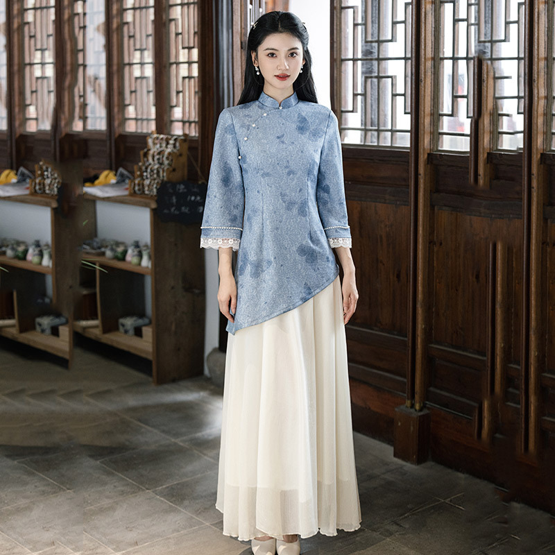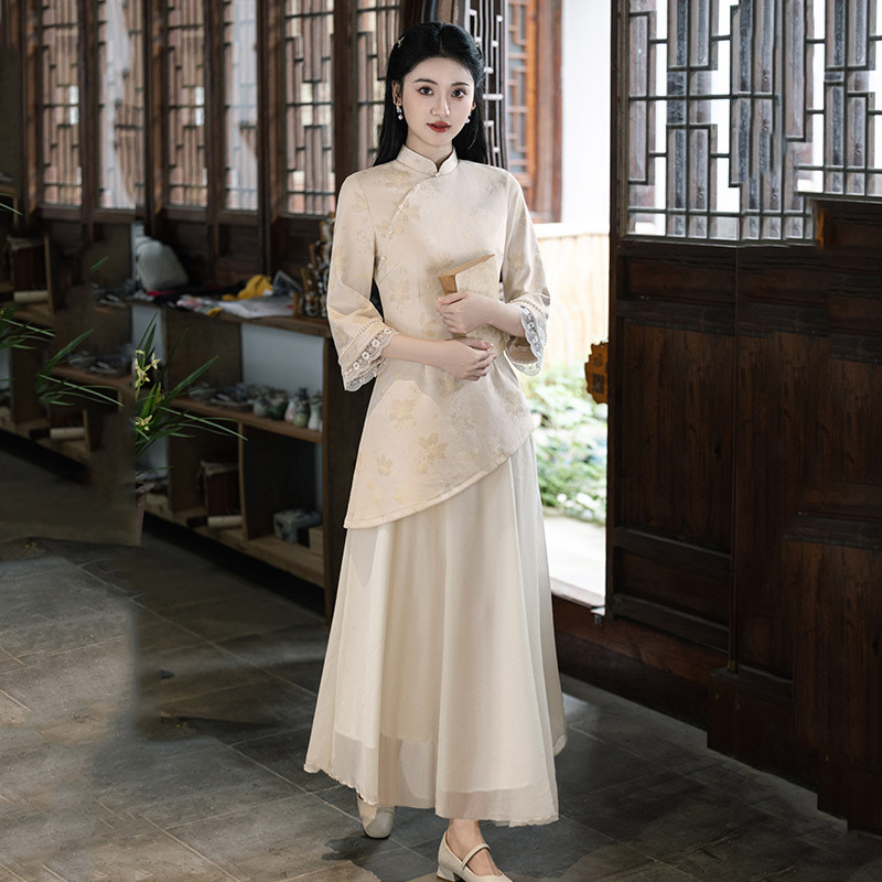 這款奧黛改良旗袍,摒棄了傳統旗袍對身材的高要求,以 “溫柔適配” 爲核心重構版型:腰部採用隱形收腰設計,不緊繃卻能自然勾勒腰線,哪怕是微胖身材也能穿出輕盈感;下擺保留奧黛經典的 A 字裙擺,長度到小腿中部,行走時裙擺隨步伐輕輕擺動,既遮腿部贅肉,又添幾分靈動;領口則將傳統立領改爲低弧度圓領,搭配精致的珍珠扣點綴,弱化了正式感,多了份柔和親切,日常穿也不會顯得拘謹,舉手投足間都是藏不住的溫柔氣質。
