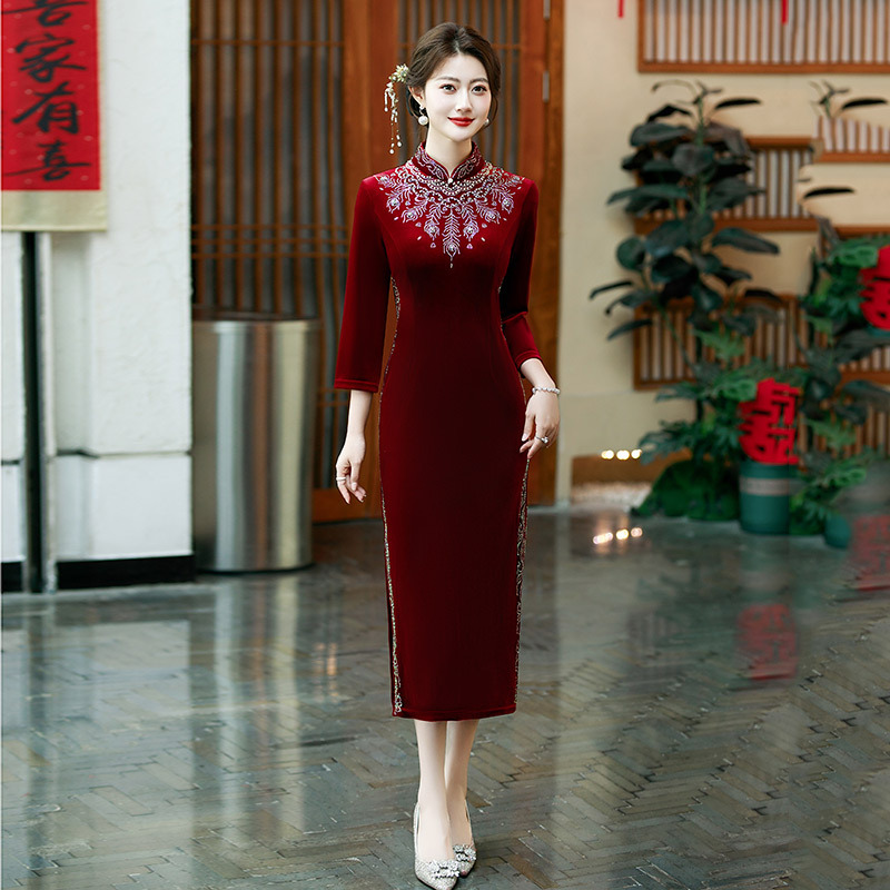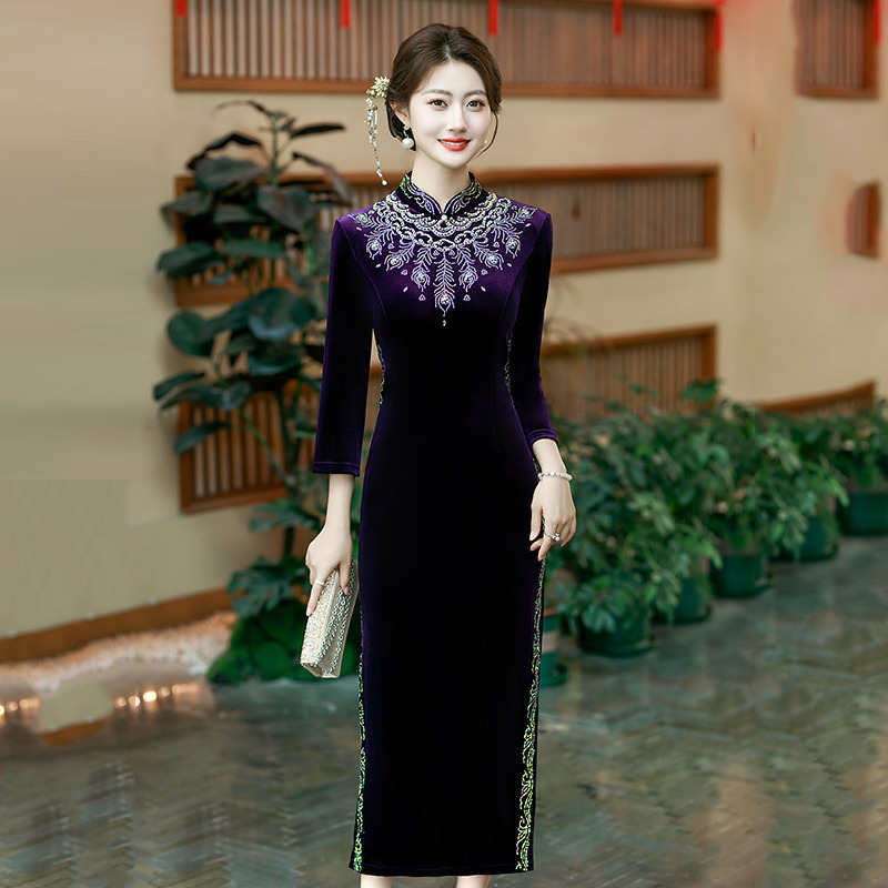 當絲絨的溫潤光澤遇見釘珠的璀璨流光,再融入旗袍經典的東方剪裁,便誕生了這件自帶 “高級感濾鏡” 的絲絨釘珠長袖旗袍。它摒棄了浮誇的設計,以絲絨的軟糯質感奠定優雅基調,用釘珠的精致細節勾勒輕奢輪廓,搭配貼合身形的長袖設計,既保留了傳統旗袍的韻味,又兼具現代穿搭的實穿性,無論是出席宴會、婚禮,還是日常打造氛圍感造型,都能讓你在人羣中脫穎而出,成爲低調卻難掩光芒的焦點。