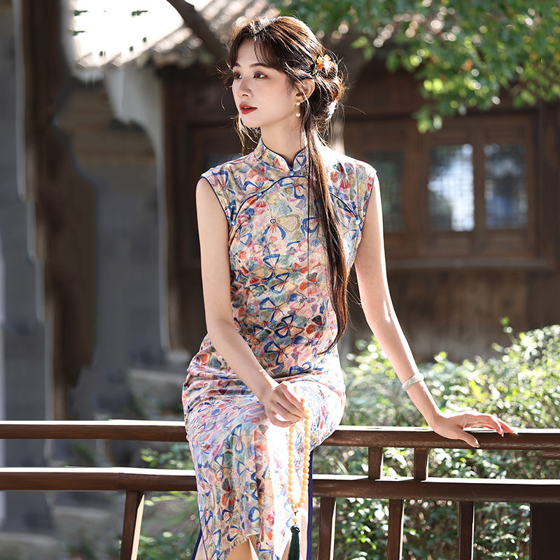 這種旗袍通常以精致的彩蝶圖案爲亮點,或採用印花工藝呈現栩栩如生的蝶影,或運用刺繡技法勾勒出立體的蝴蝶造型,寓意着福氣疊疊、好運連連。無袖的設計則巧妙地展現出女性優美的肩頸線條,同時增添了幾分靈動與性感。長款的版型修長典雅,行走間裙擺搖曳,更顯溫婉氣質。
