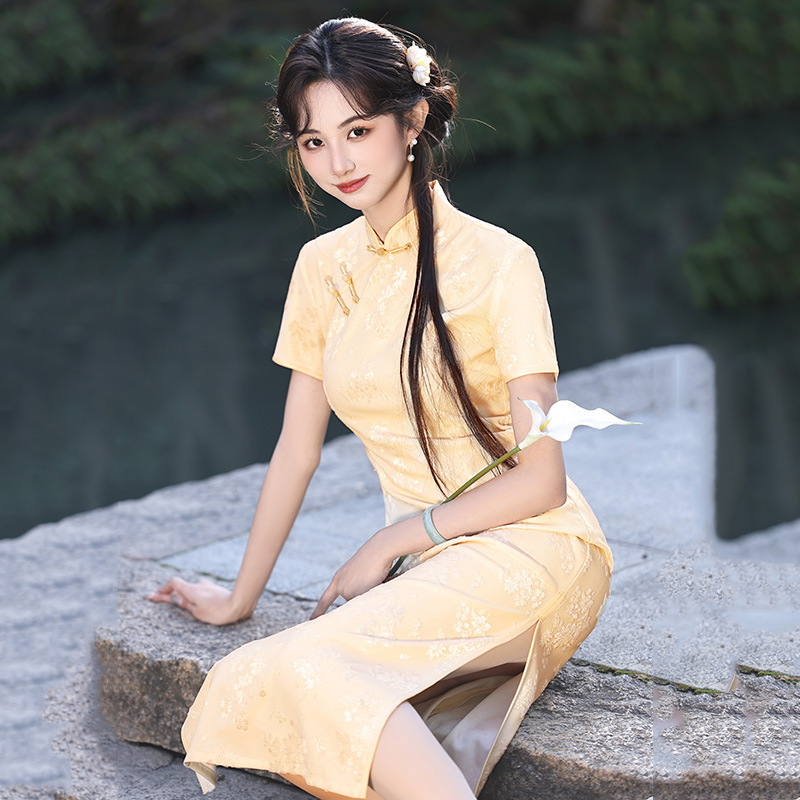 黃色改良旗袍長款融合了復古韻味與現代時尚,以下是一些打造其高級感搭配的密碼: