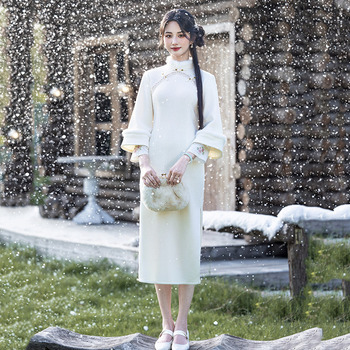 當朔風卷起枯葉,冬日的寒意漸濃,東方女子的雅致穿搭卻從不應被溫度束縛。這款改良版長袖旗袍,以加絨加厚的貼心設計,讓國風韻
